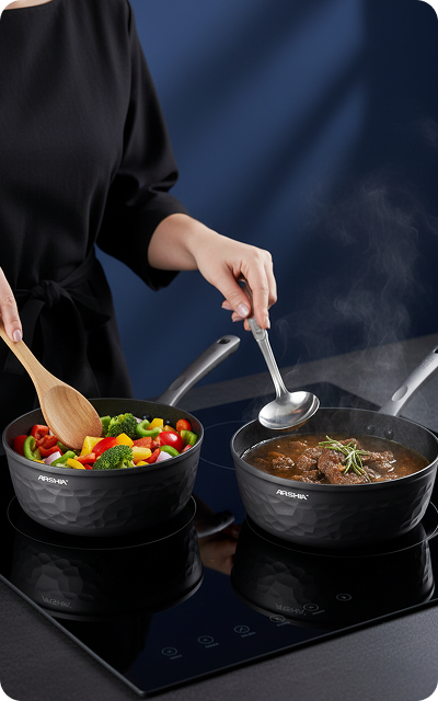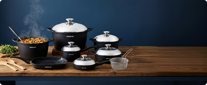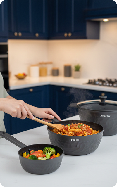 اكتشفي أفضل طقم طهي بطبقة دايموند غير لاصقة، توزيع حرارة مثالي، وخامات تعيش معاكِ سنين.